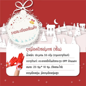 - ถุงมือ: ผ้านุ่มคุณภาพสูง บุขนภายในสวมใส่สบาย ตกแต่งโบว์สีแดงและกระดิ่งทองเพิ่มความหรูหรา
