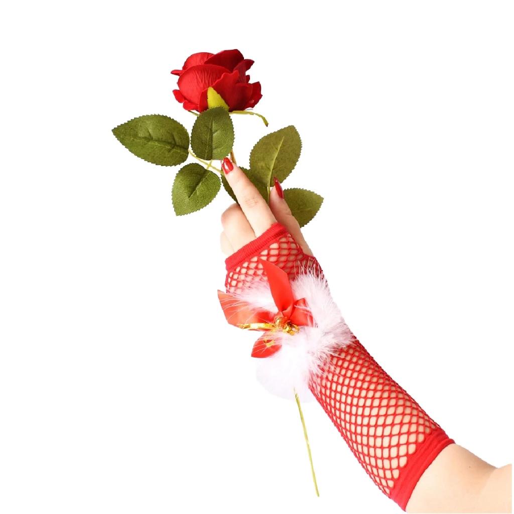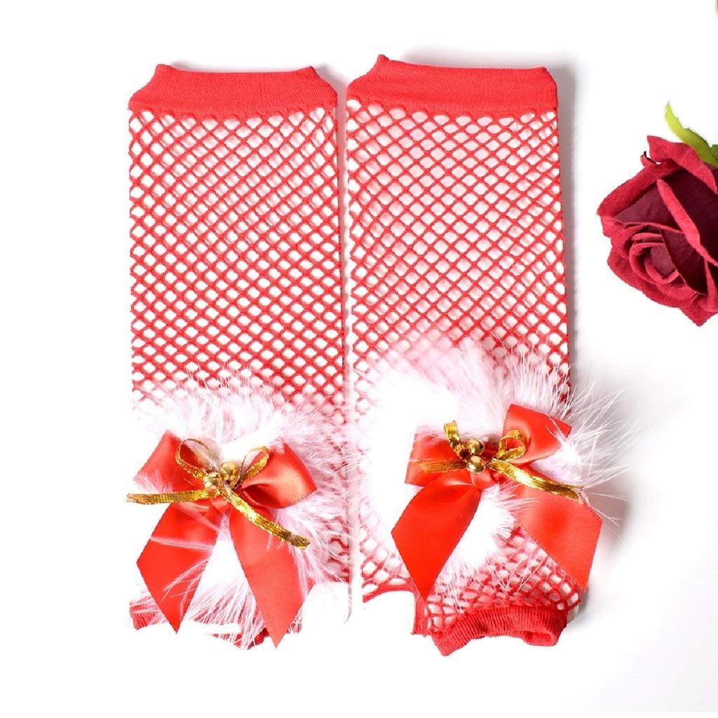 ถุงมือตาข่ายยาวคริสต์มาส (Red Long Fishnet Gloves) สีแดงพร้อมโบว์และขนนุ่ม