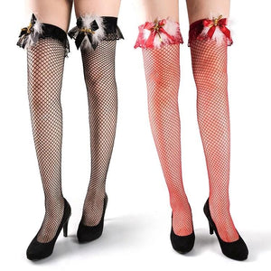 ชุดถุงเท้ายาว+ถุงมือตาข่ายคริสต์มาส สีแดงดำ โบว์ ขนนุ่ม เซ็กซี่ แฟนซี ปาร์ตี้ xmas roleplay พร้อมส่ง