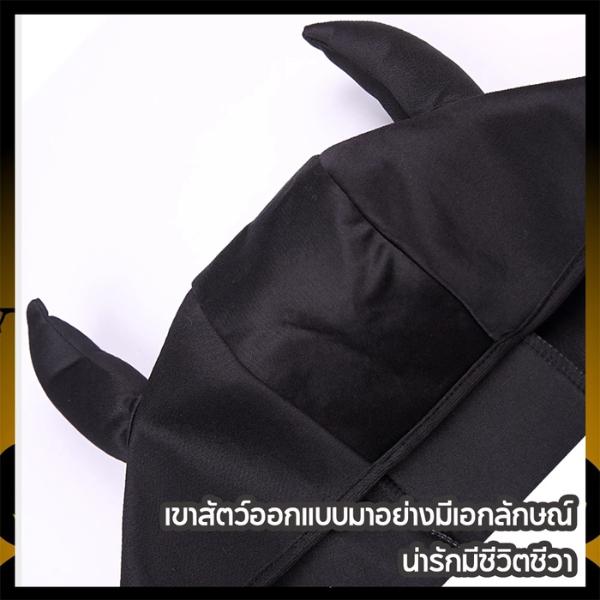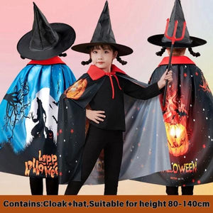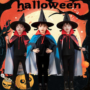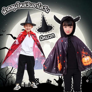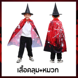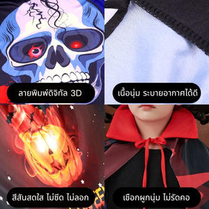 สไตล์ : ผ้าคลุมแบบมีหมวกปลายแหลม (บางรุ่นมีเขาปีศาจ) พร้อมลายพิมพ์ 3D ฟักทอง เปลวไฟ และแมงมุม เพิ่มความสมจริง