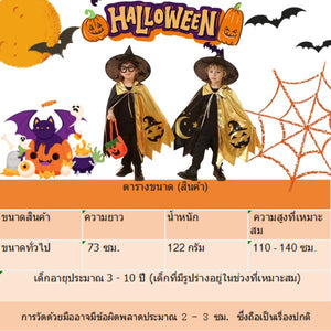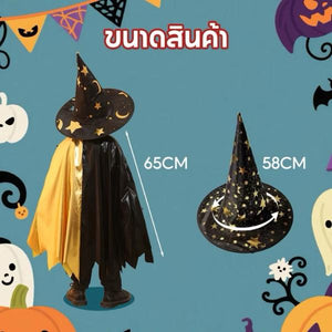 สไตล์: ผ้าคลุมแม่มดทรงยาว พร้อมหมวกทรงแหลมเข้าชุด พิมพ์ลายพระจันทร์และฟักทองทั่วผืน