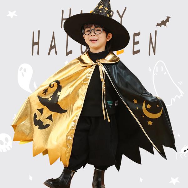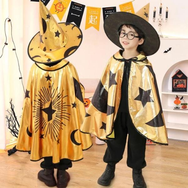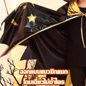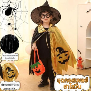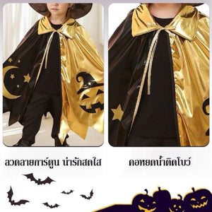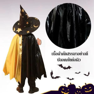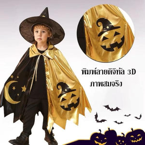 ผ้าคลุมแม่มดฮาโลวีนเด็ก สีดำทอง ลายดาว ดวงจันทร์และฟักทอง พร้อมหมวก | ชุดคอสเพลย์แฟนซี ปาร์ตี้ การแสดงสุดน่ารัก