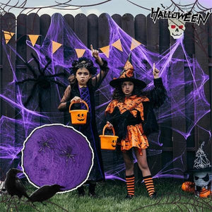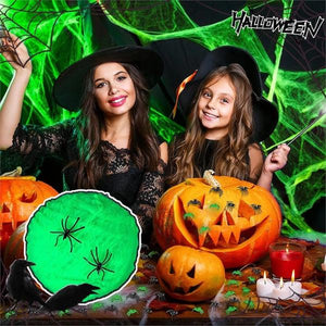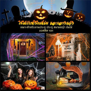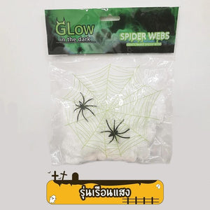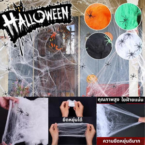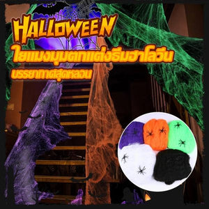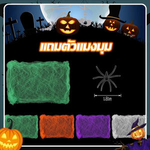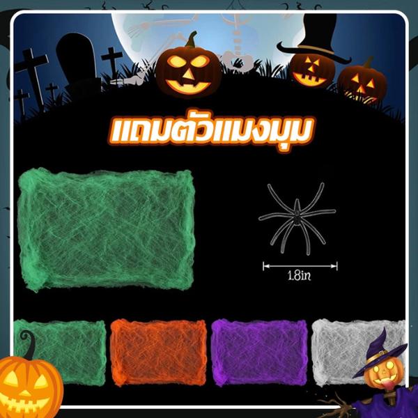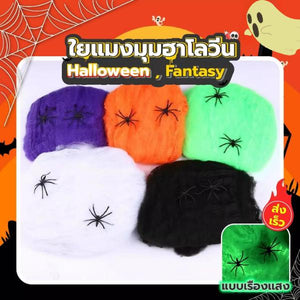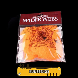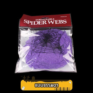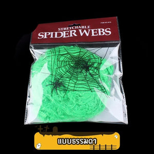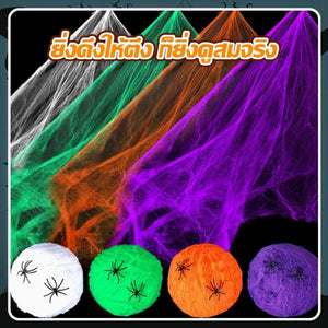 ใยแมงมุมปลอมสีสันสดใส พร้อมแมงมุมตกแต่ง พร็อพปาร์ตี้ฮาโลวีน ตกแต่งบ้านผีสิง ฉากหนีห้องผีสิง