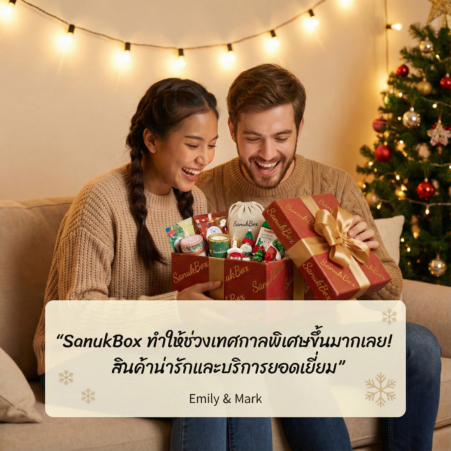 ได้รับกล่องของขวัญเทศกาลจาก SanukBox แล้วประทับใจมาก เปิดปุ๊บก็ได้กลิ่นอายอบอุ่น ชิ้นเล็กๆ และการแพ็กดูตั้งใจมากกว่าของออนไลน์ทั่วไป